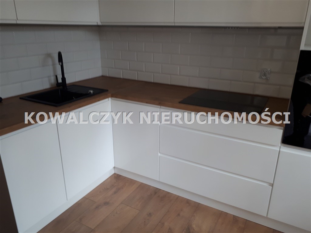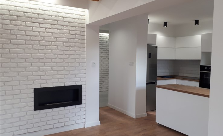 Na podłogach w pokojach panele a w łazience oraz przedpokoju kafelki ( ogrzewanie podłogowe). Kuchnia całkowicie wyposażona w sprzęt AGD( lodówka, zmywarka, piekarnik, płyta indukcyjna, okap, zlew) oraz meble w zabudowie. W salonie ozdobna ściana z kominkiem olejowym.