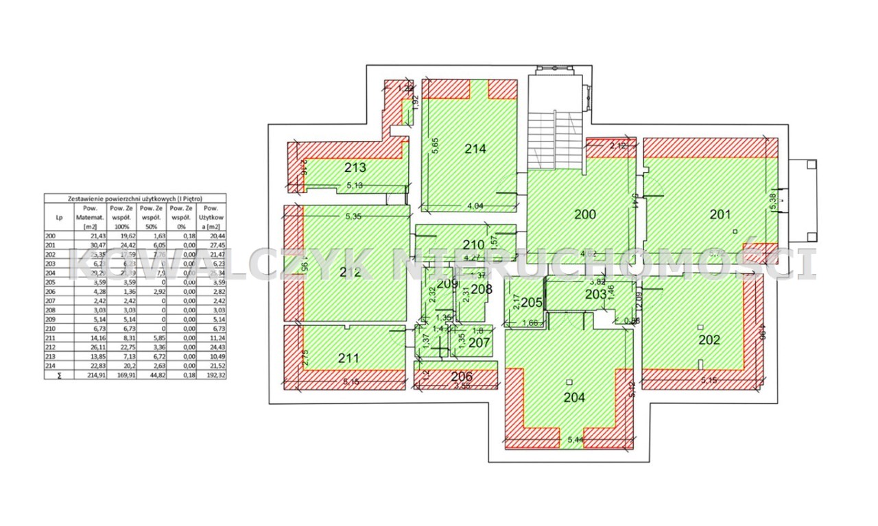 Piętro (1) – 192,32 m²: 5 osobnych dużych pomieszczeń biurowych oraz zaplecze administracyjno-socjalne.