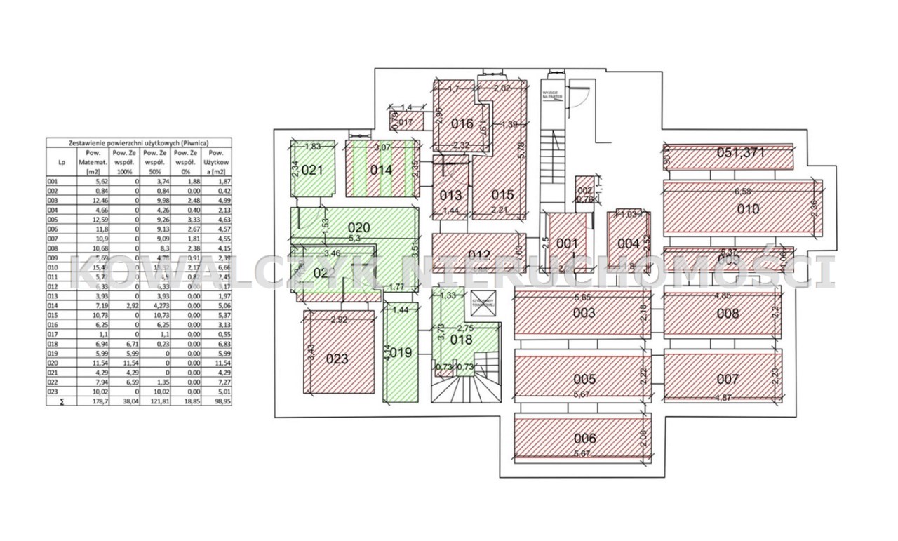 Poziom -1 (piwnica) – 98,95 m²: pomieszczenia techniczne, kotłownia, rozdzielnia elektryczna, UPS, skarbiec i magazynki.